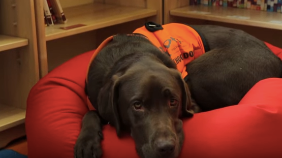 The chocolate lab is part of a national program called Dogs Helping Kids. Responding to the flash cards is only small part of his duties.